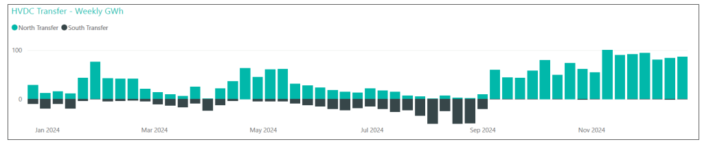 Figure 3: Electricity transfers between the North and South Islands in 2024. Southward transfer (black) dominates in August during the maximum of the 2024 dry winter. Vertical axis is in GWh. Source: Transpower.